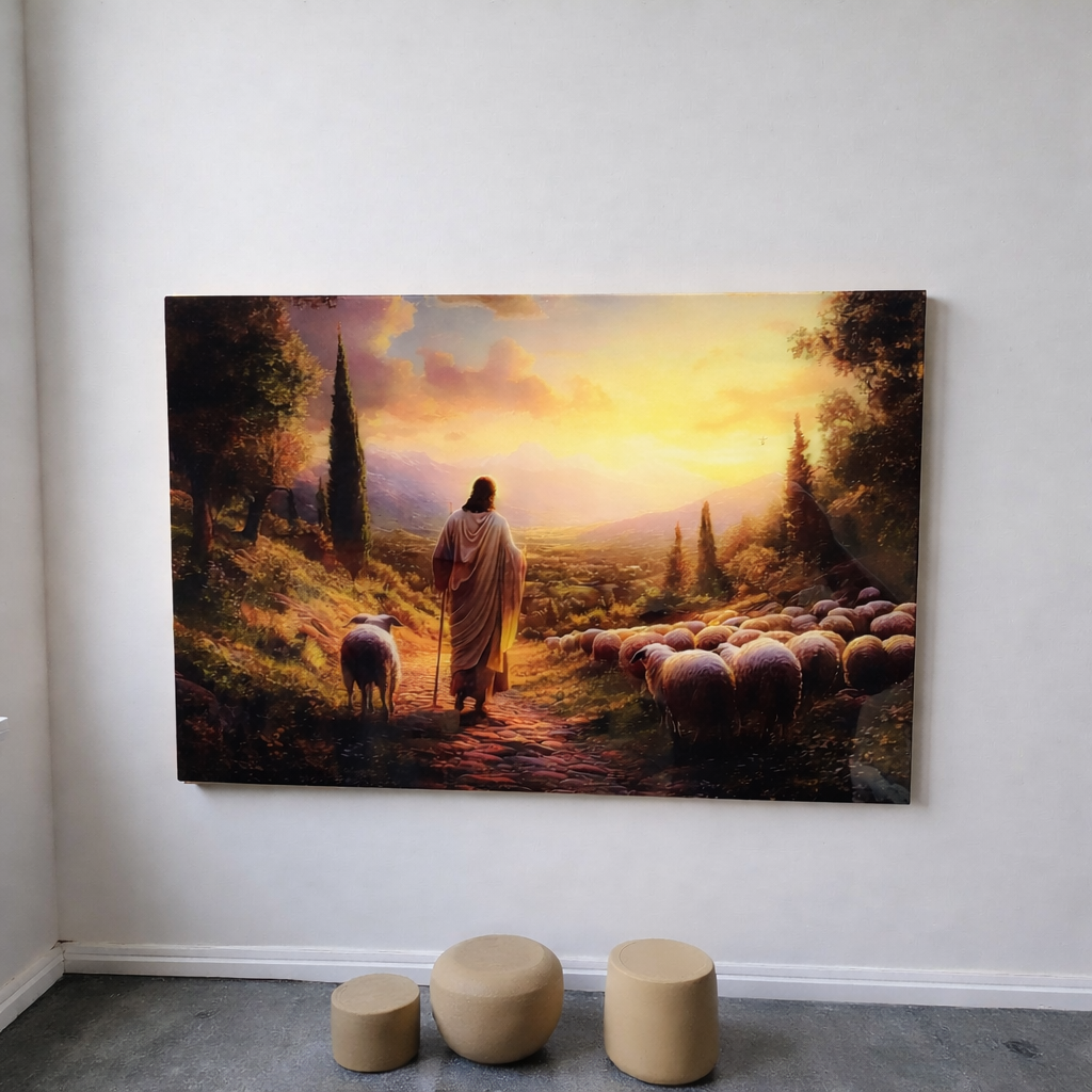 „Jezus naszym Pasterzem” to wyjątkowy, pełen światła obraz, który przedstawia Chrystusa prowadzącego owce ku spokojowi i nadziei. Ciepłe, złote barwy zachodu słońca oraz harmonijna kompozycja wprowadzają do wnętrza ciszę, poczucie bezpieczeństwa i duchową obecność.